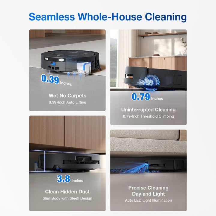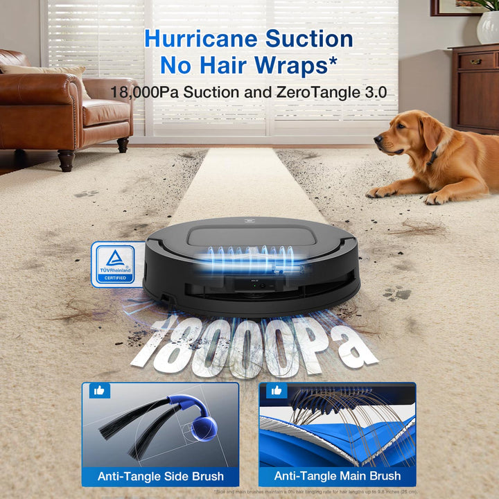Automated vacuum cleaner and mop with edge cleaning, anti-tangle brushes, AI Instant Re-Mop, and 3D sensors that detect obstacles and avoid pets.
